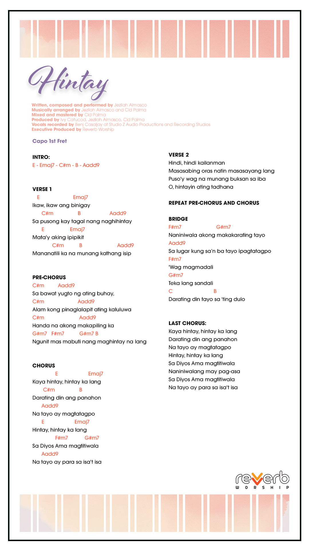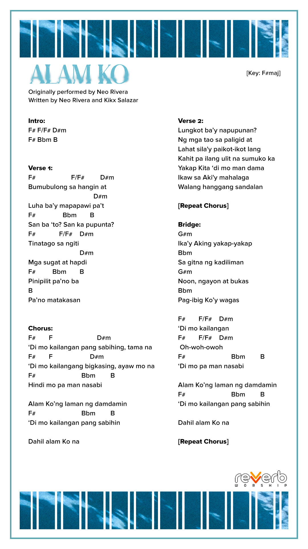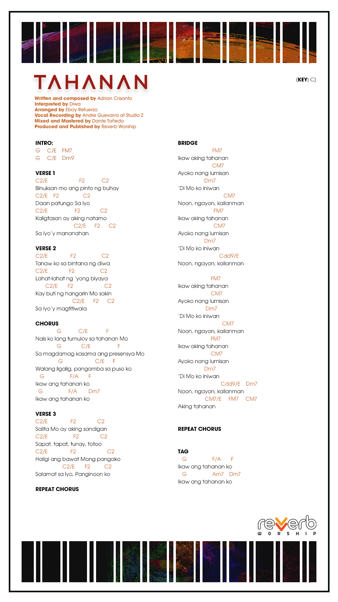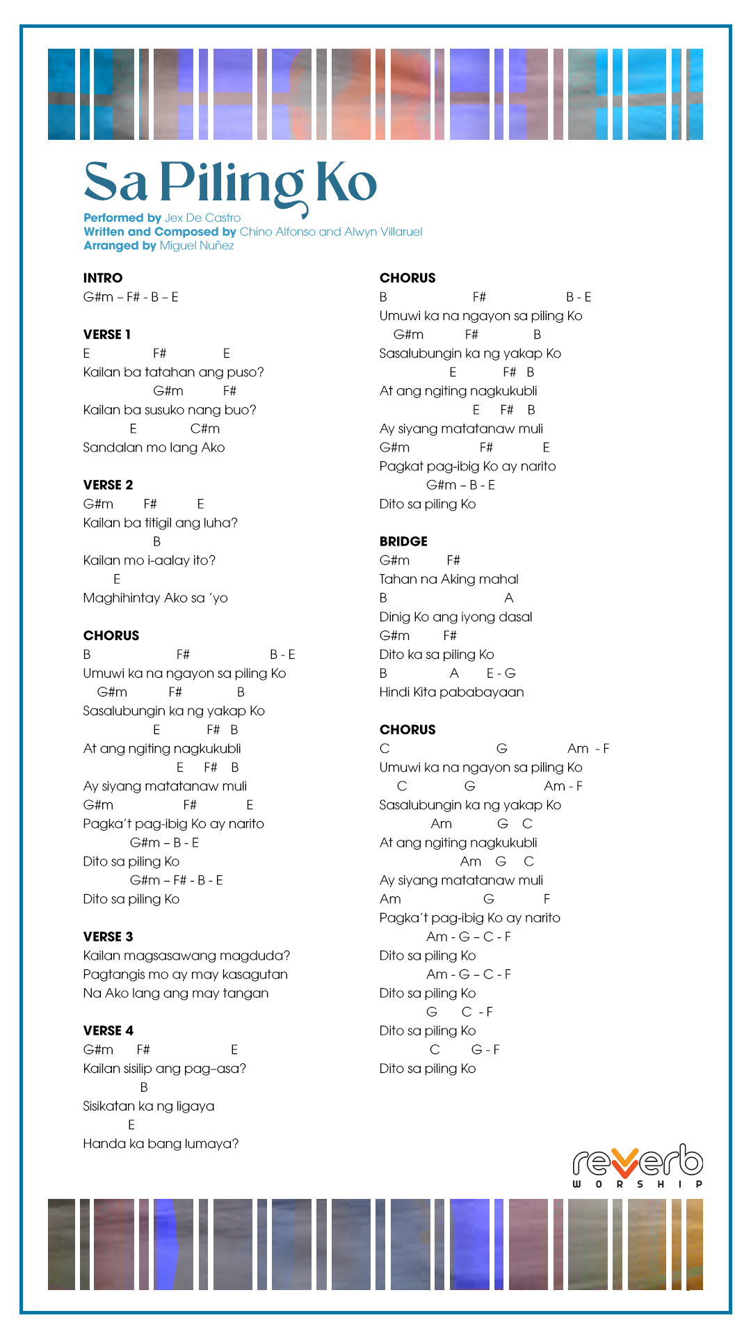 Record your own covers or sing our songs during your church services’ praise and worship line-up. FREE lyrics, chord charts, and minus ones for all Reverb Worship original songs are available for your personal use.